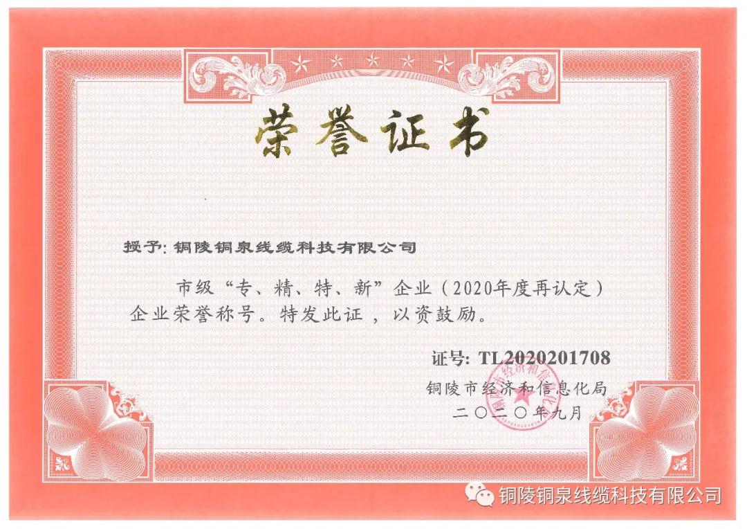 經(jīng)過層層評比,近日,銅泉公司通過了2017年度市級專精特新企業(yè)復核認定!此次的復核通過再次證明了銅泉線纜在市場、質(zhì)量、效益、發(fā)展等方面的先進性和示范性,更是對我公司在“專業(yè)化、精細化、特色化、創(chuàng)新化”等方面所做努力的高度肯定。